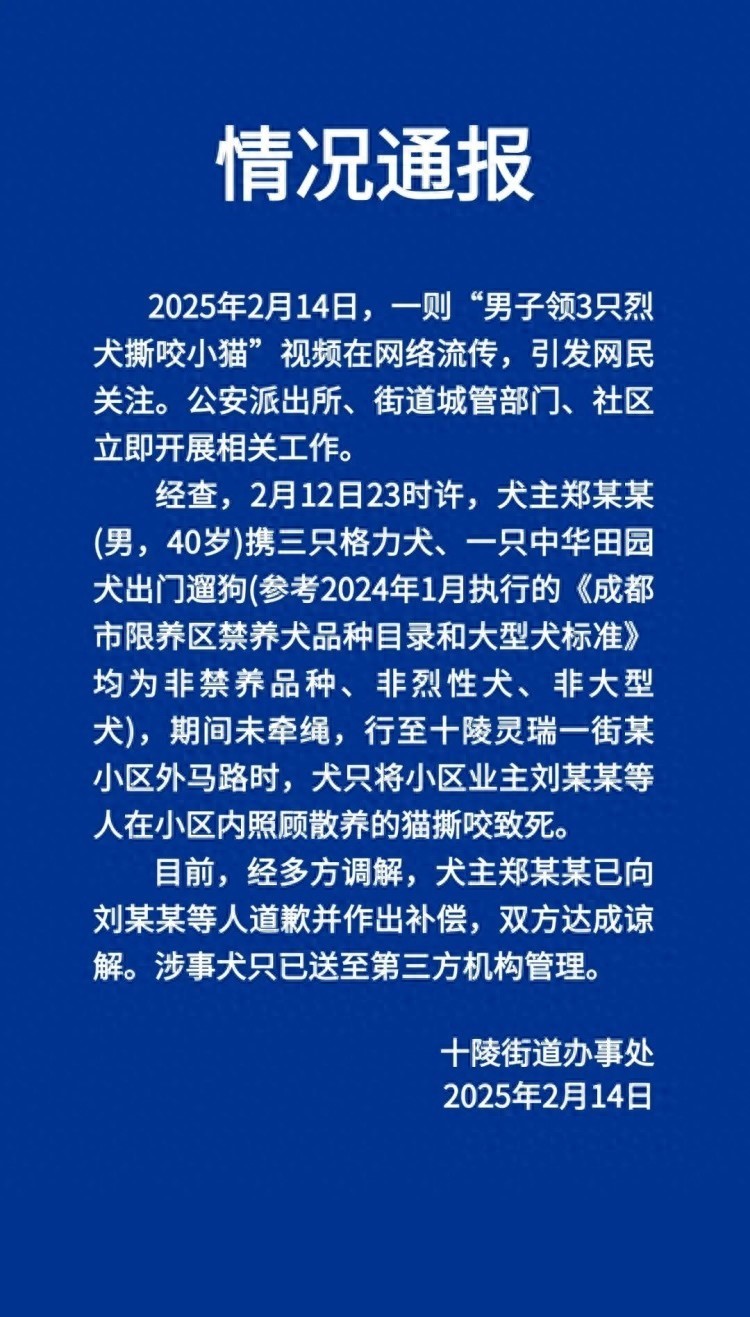 2月12日晚,成都龙泉驿区灵瑞一街一男子领三只烈犬撕咬小猫并抛尸。一名途经此处的司机用行车记录仪录下视频。2月14日晚,成都龙泉驿区十陵街道办事处官微“东成十陵”发布情况通报:2月14日,一则“男子领3只烈犬撕咬小猫”视频在网络流传,引发网民关注。公安派出所、街道城管部门、社区立即开展相关工作。经查,2月12日23时许,犬主郑某某(男,40岁)携三只格力犬、一只中华田园犬出门遛狗(参考2024年1月执行的《成都市限养区禁养犬品种目录和大型犬标准》均为非禁养品种、非烈性犬、非大型犬),期间未牵绳,行至十陵灵瑞一街某小区外马路时,犬只将小区业主刘某某等人在小区内照顾散养的猫撕咬致死。目前,经多方调解,犬主郑某某已向刘某某等人道歉并作出补偿,双方达成谅解。涉事犬只已送至第三方机构管理。
